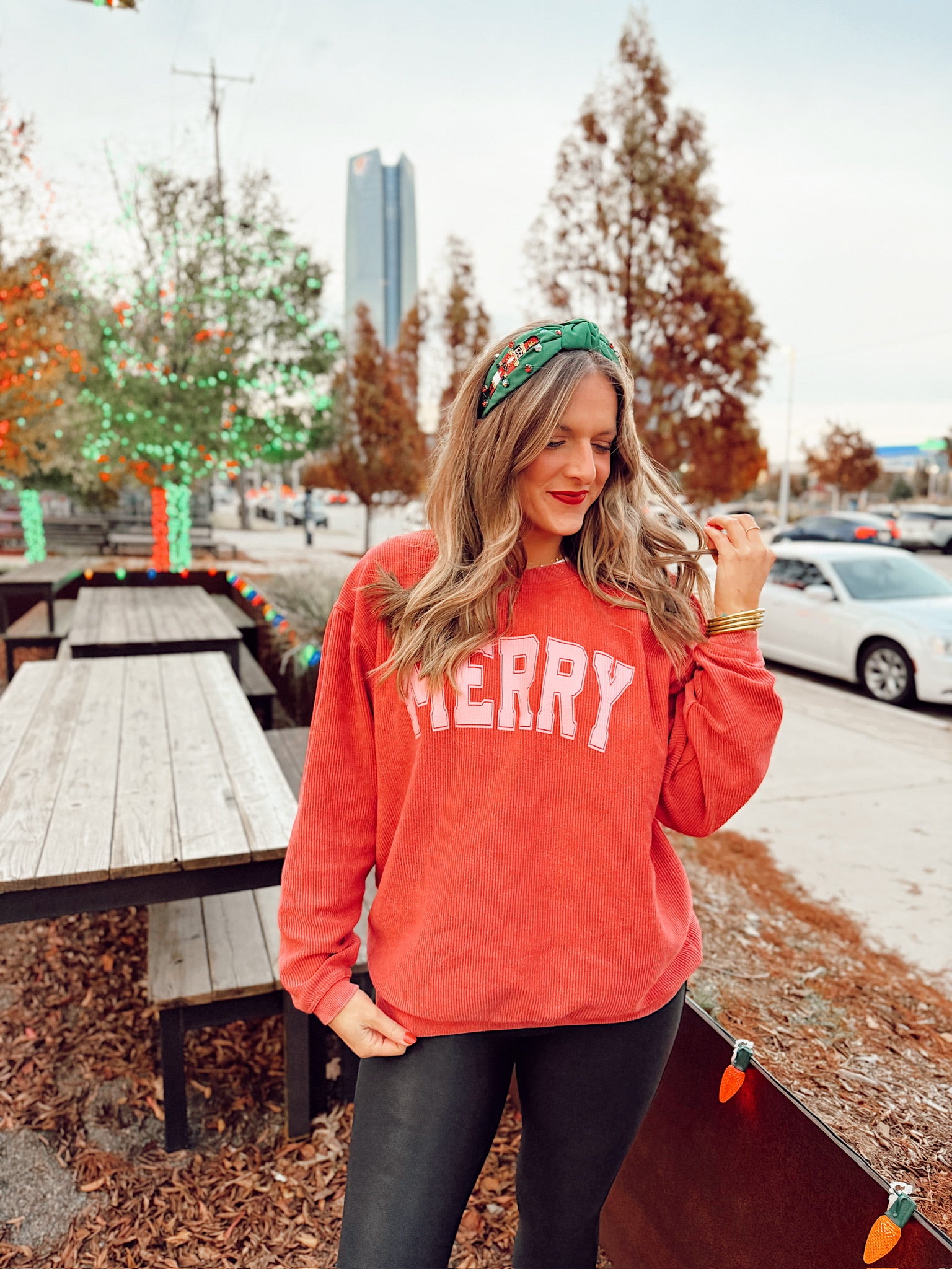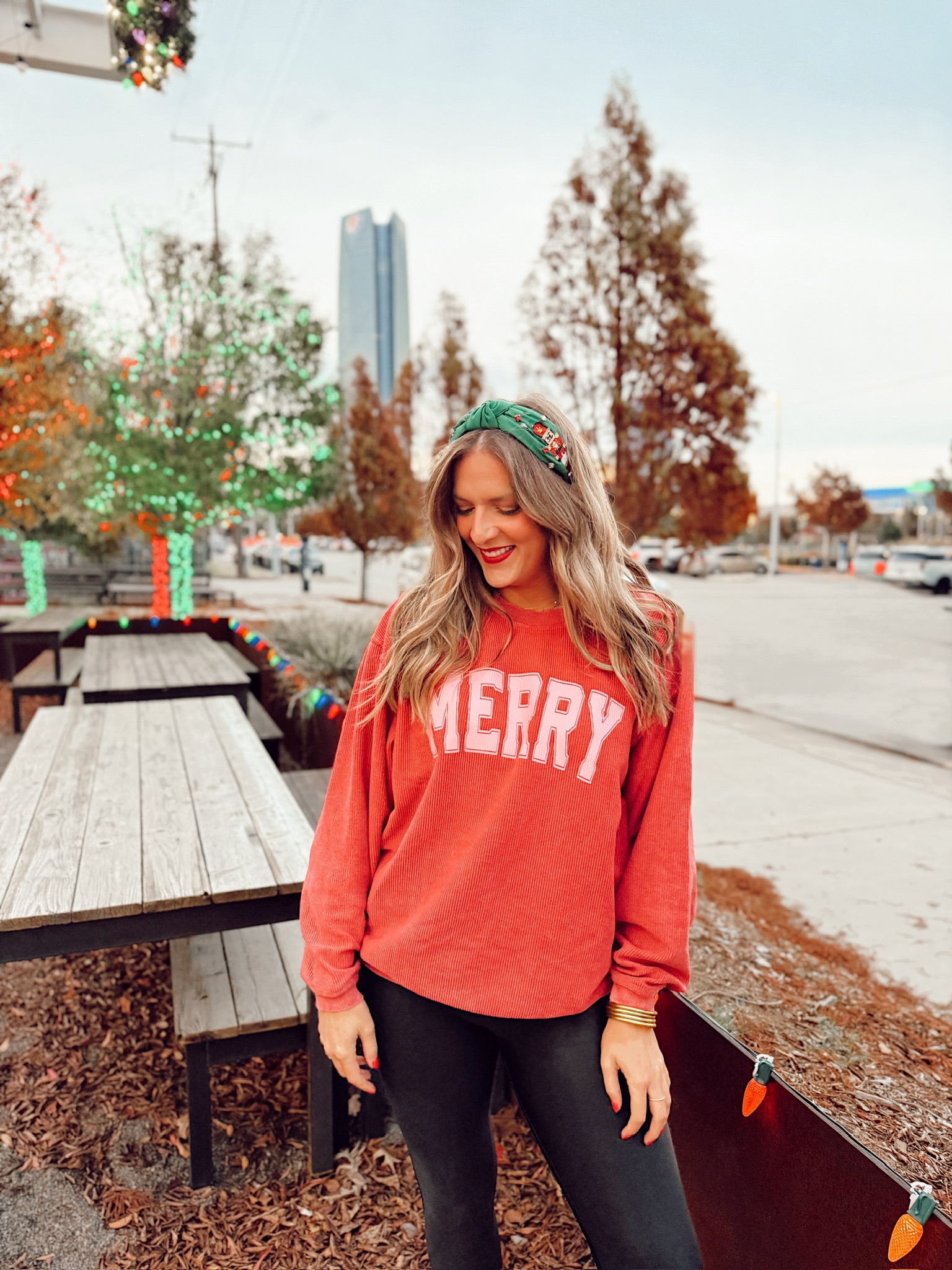 MERRY! This red corded crewneck sweatshirt is a must have for all of this seasons holiday festivities. This timeless, holiday errand, movie watching, minimalistic sweatshirt will be your go to this season. Featured in our best selling corded sweatshirt in a red colorway with pink "MERRY" block letters across the center front chest. Lighting of edits may vary color image.