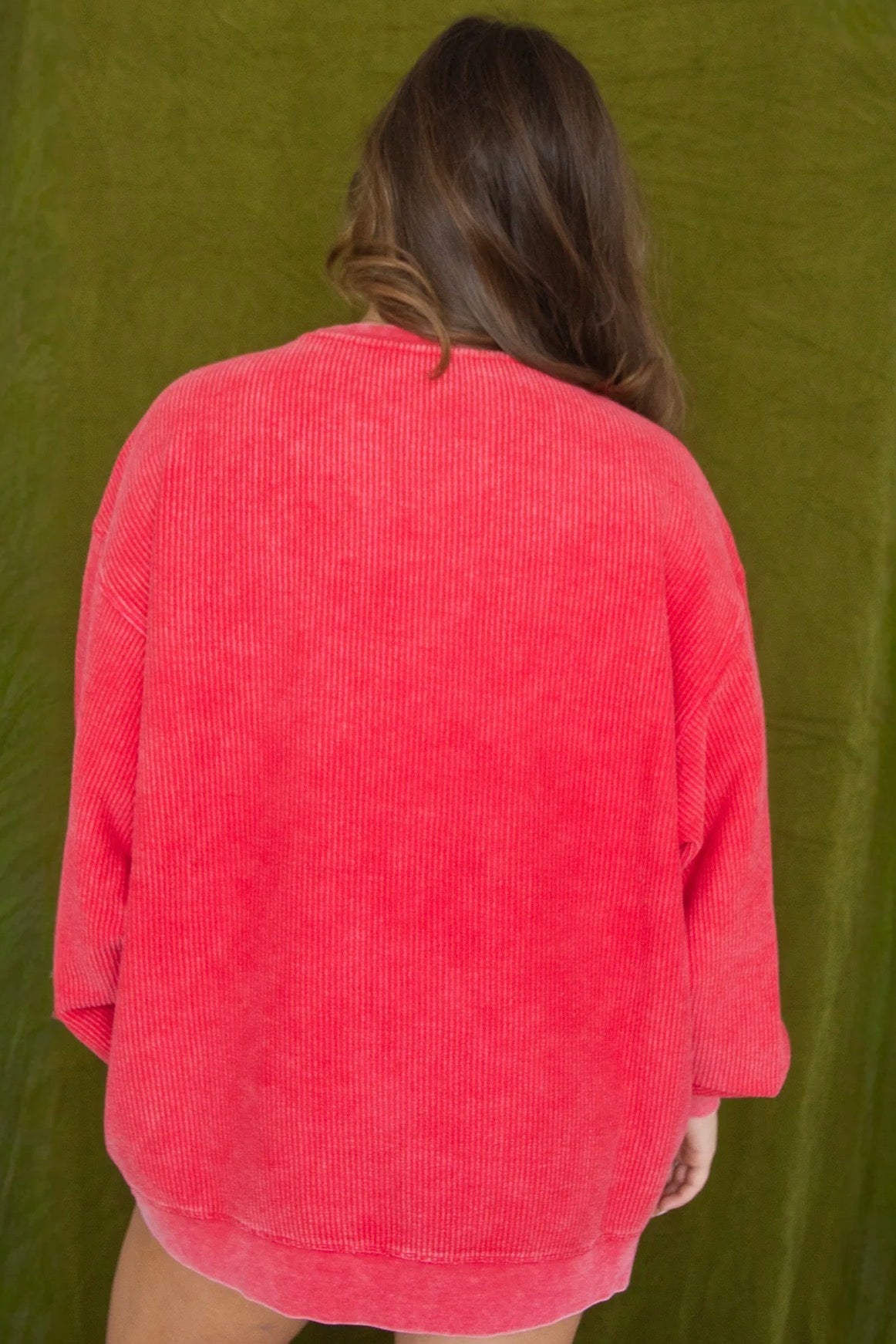 MERRY! This red corded crewneck sweatshirt is a must have for all of this seasons holiday festivities. This timeless, holiday errand, movie watching, minimalistic sweatshirt will be your go to this season. Featured in our best selling corded sweatshirt in a red colorway with pink "MERRY" block letters across the center front chest.